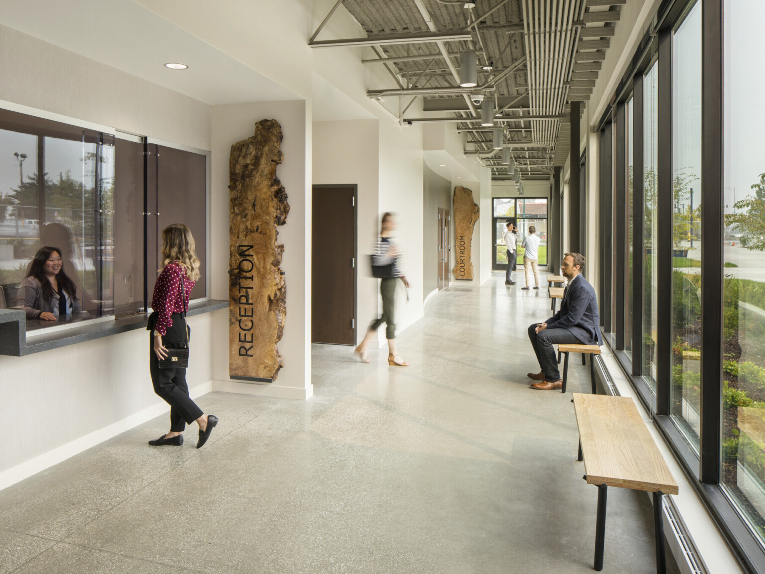 Tukwila’s growth has brought greater diversity, and now more than 180 languages are spoken in the city. The new justice center design accommodates occupants of all backgrounds. Visual cues in lieu of words provide a universal language of wayfinding. Court and probation interview rooms have technology for web conferencing, which allows local translators in the region to assist other remote locations. Sensitivity to cultural symbols was considered by the design team throughout the project to ensure the building serves as a safe and respectful place for all cultures.