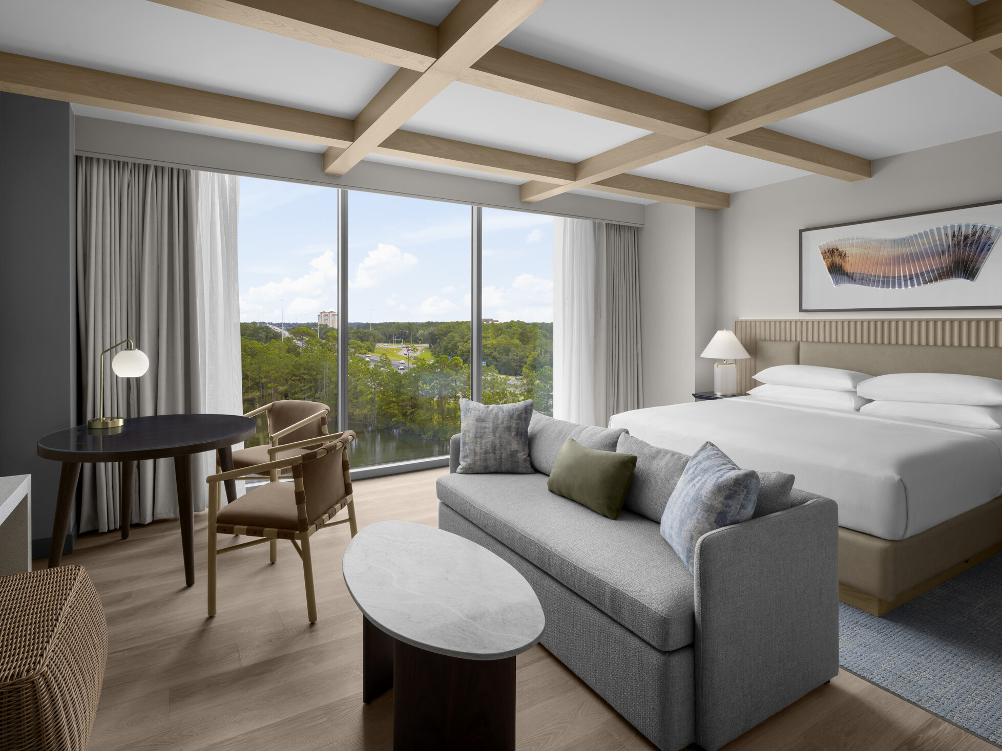 Interior design by HVS Design extends the architectural narrative, translating the building’s connection to landscape into calming palettes, organic forms, and layered lighting that shape spaces for rest and reflection. Soft blues and greens, natural textures, leather-accented millwork, and artisan tile introduce warmth and depth, while preserved greenery and locally inspired artwork connect guests to Jacksonville’s coastal setting.