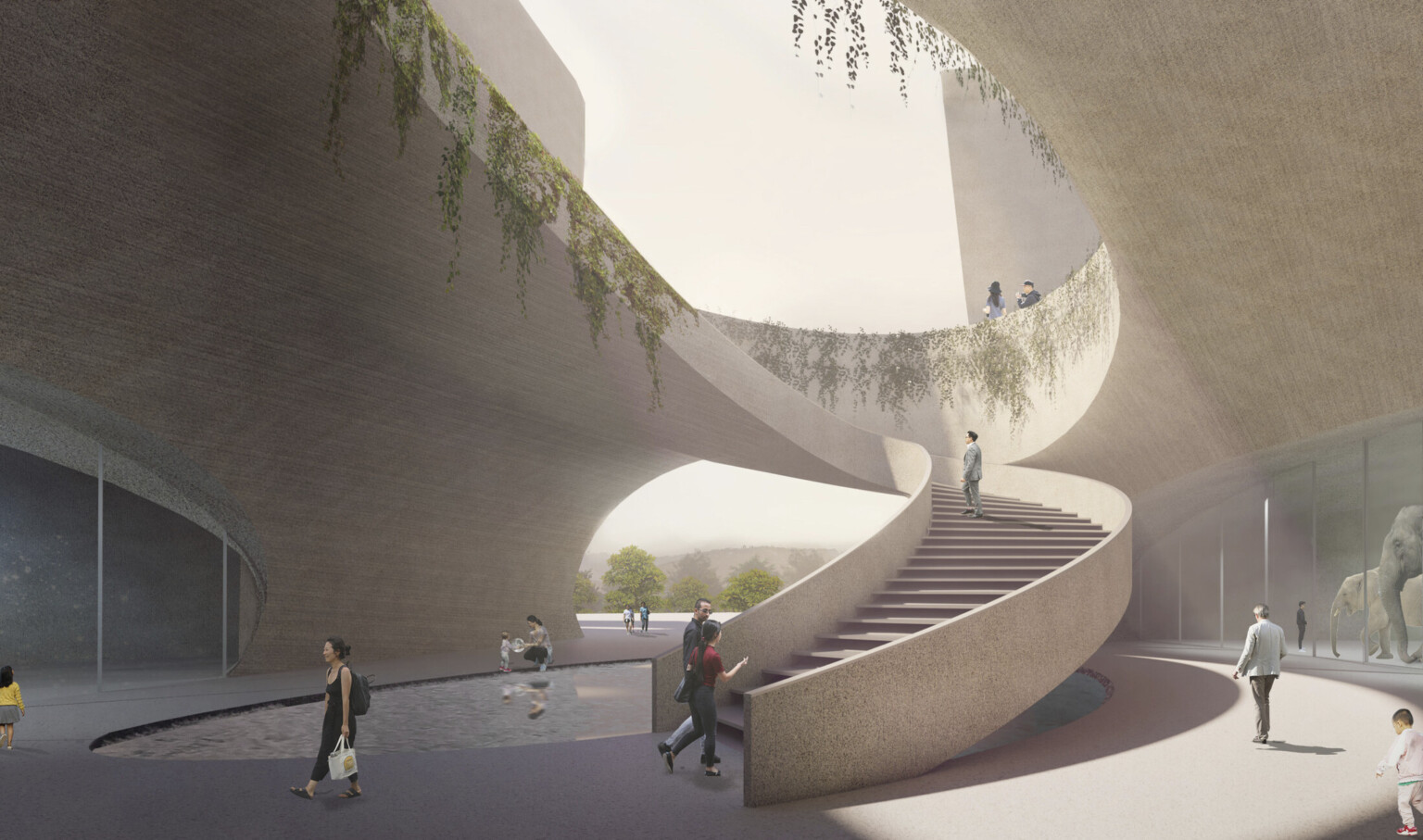 The forms are carved away through the center by an elevated pathway that helps define each form and the exhibits within. Fluid and flexible spaces between the exhibits offer growth potential and an educational environment for a range of patrons. Circulation links gallery spaces with a centralized lobby filled with additional amenities. Carve-outs in the façade allow patrons to take a break from the exhibits and venture outside to the different landscape features around the site. We provided architecture design services.